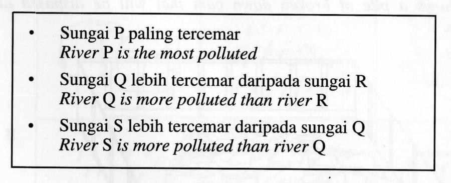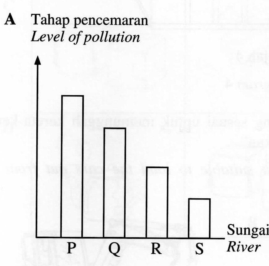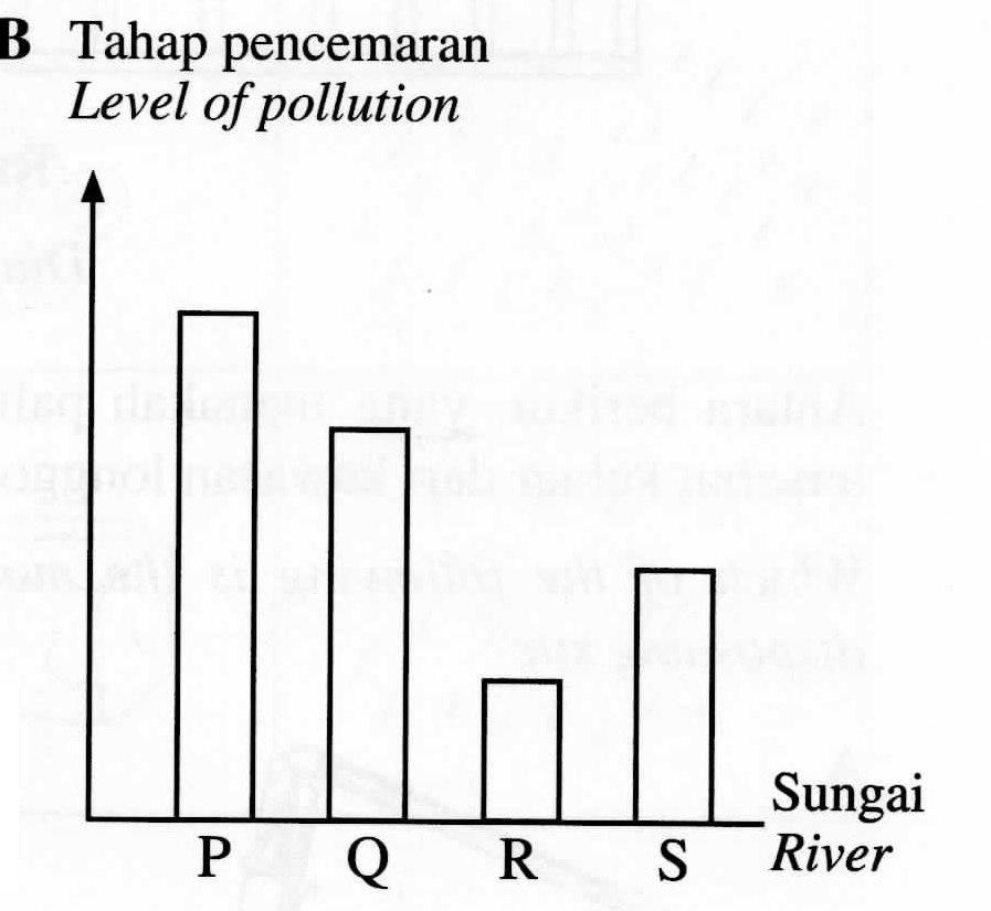 Maklumat berikut adalah tentang empat batang sungai P, Q, R dan S. Carta palang yang manakah mewakili maklumat di atas?